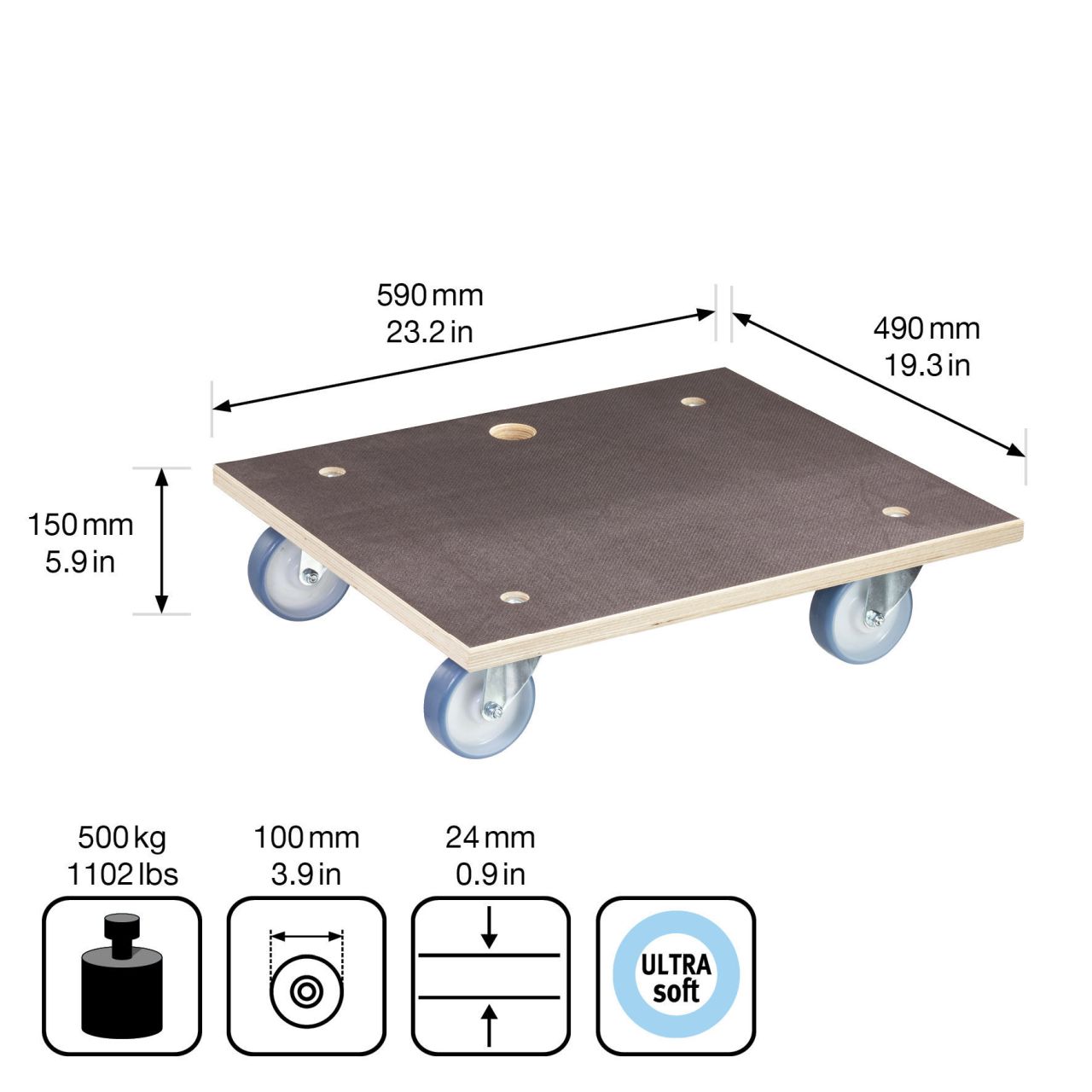 Die Transporthilfe ist für das leichte und bequeme Bewegen auch echter "Schwertransporte" bestens geeignet - im Büro, in der Werkstatt, zu Hause, beim Einkauf und beim Umzug. Vier leichtlaufende ULTRASOFT-Transportgeräterollen mit Rollenlager sorgen für ausgezeichnete Beweglichkeit auf allen empfindlichen und versiegelten Boden-Oberflächen.